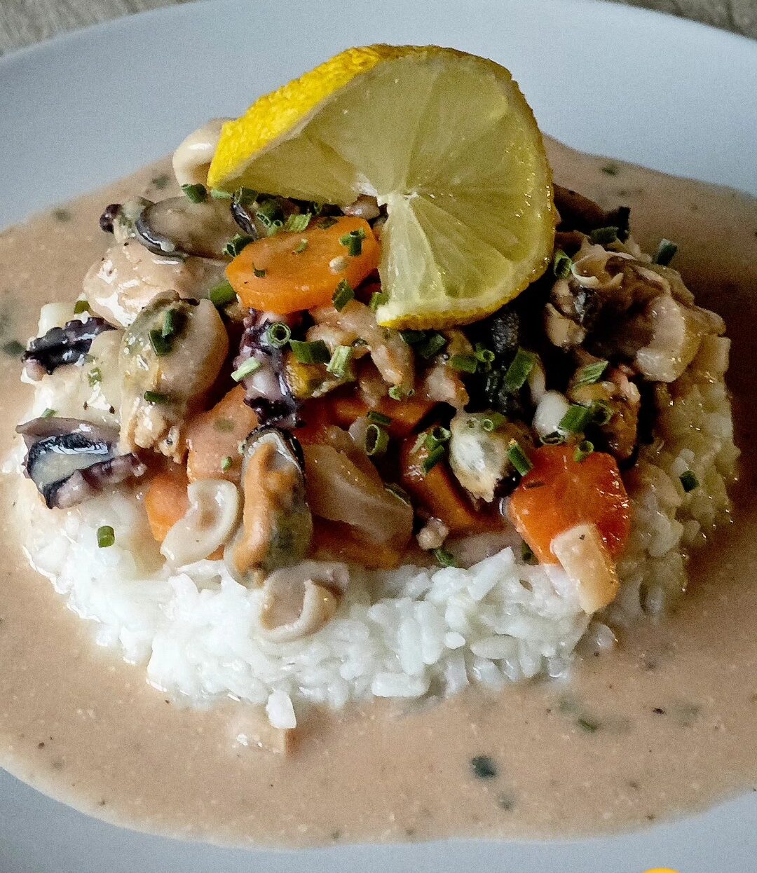 Blanquette de crustacés (moules, crevettes, encornet, poulpe confit, st jacques) cuit a basse température, sauce crémeuse à la sauce tomate légèrement relevée.