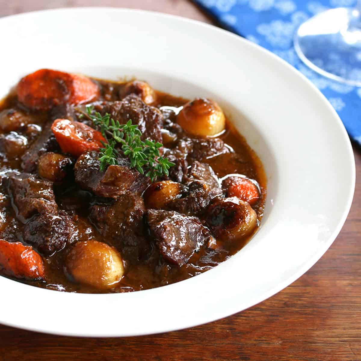 Paleron de Bœuf mijoté, carottes, oignons, vin rouge et champignons, servit avec pâtes au beurre.